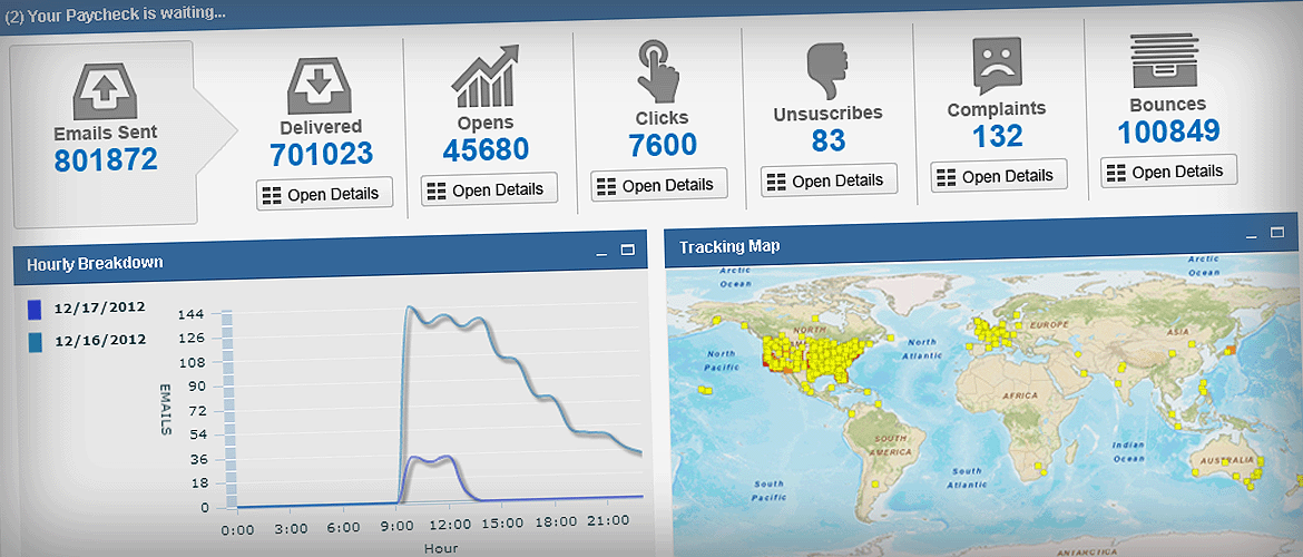 Every recipient event (opens and clicks) is tracked in the system - down to the city where it happened. This helps tremendously in determining where your traffic is coming from, since there are advertisers who need traffic from specific geographic locations. Many other reports are also available, including recipient clicks, opens, unsubscribes, complaints, destinations domains, and more.